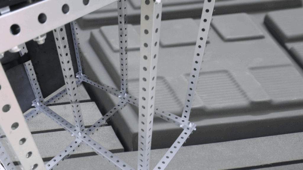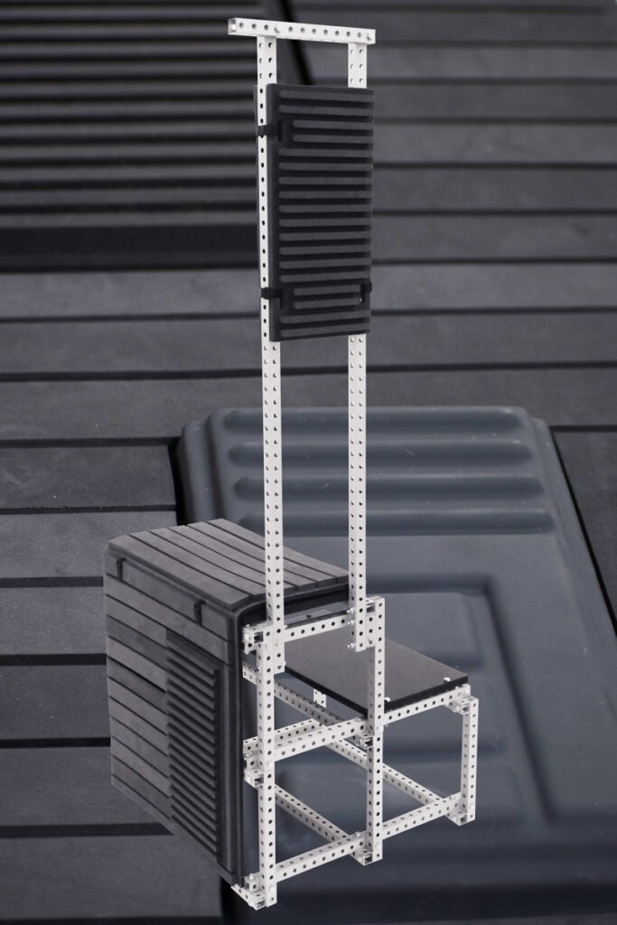 The design consists of 12 large plinths that elevate performers’ and audience’s presence, a stageset for a main performer and a series of large mats made of neoprene, foam and vacuum-formed plastic. The design is put together through ratchet straps and other tension mechanisms. Temporarily tied together, objects to objects and objects to performers, only existing together for the duration of the performance, these strappy, interim methods of assembly and material palette resonate with the common happenings in this Club.