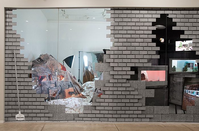 Information booth for a speculative business called [postcommodity.services] that provides radical resurfacing services as an oblique approach to sustainability.